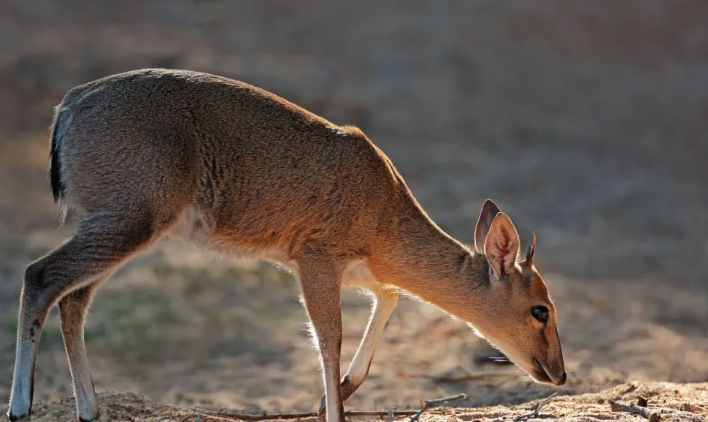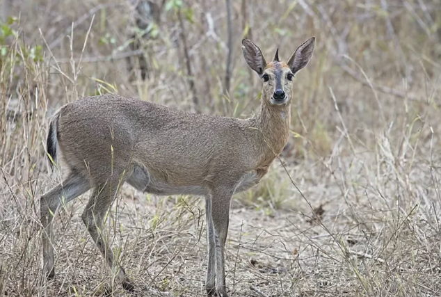 The Common (Grey) Duiker: A larger, long-legged antelope built for speed and endurance across the exposed savannas and bushlands of Eastern and Southern Africa. It exhibits unique adaptations such as reversed sexual dimorphism (females are larger) and is a highly adaptable omnivore, consuming plants, insects, small reptiles, and carrion. When startled, it is known for its characteristic zigzag running pattern.